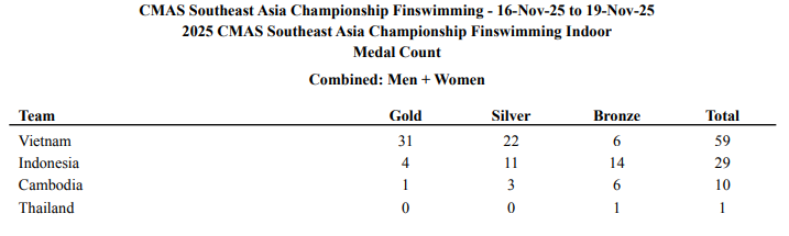 Klasemen perolehan medali 2025 CMAS Southeast Asia Championship Finswimming Indoor Senior: