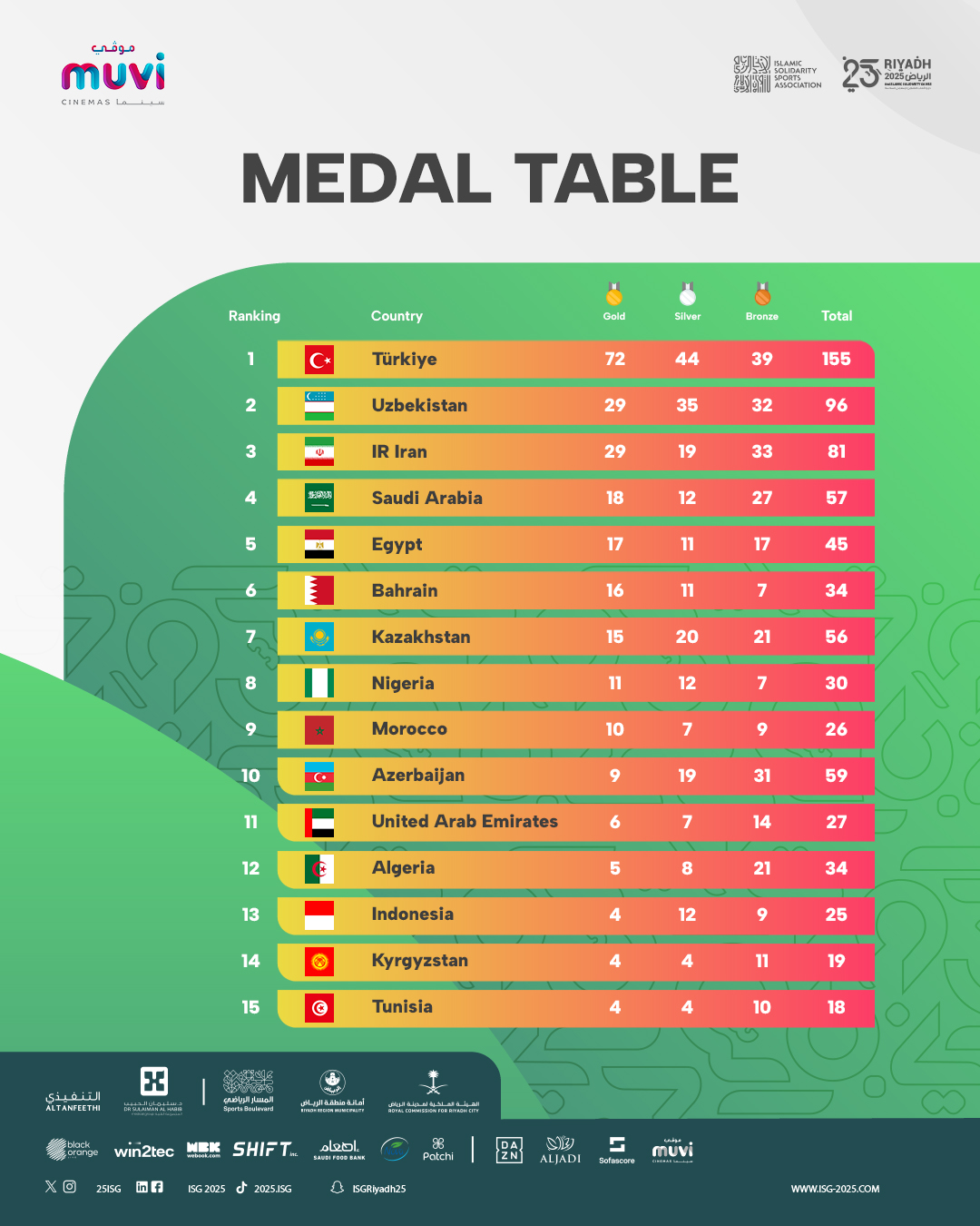 Riyadh – Kontingen Indonesia menuntaskan kiprah di ajang Islamic Solidarity Games (ISG) Riyadh 2025 dengan koleksi 25 medali—terdiri dari 4 emas, 12 perak, dan 9 perunggu. Hasil itu membuat kontingen Merah Putih berada peringkat ke-13 klasemen akhir multievent yang diikuti 57 negara peserta.