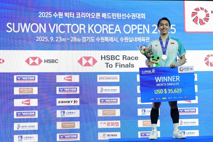 Suwon — Pebulutangkis Jonatan Christie akhirnya mengakhiri rentetan hasil kurang maksimal tahun ini dengan menjuarai Korea Open 2025 di Suwon, Korea Selatan. Di partai final, ia mengalahkan andalan Denmark, Anders Antonsen, dengan skor 21-10, 15-21, dan 21-17 dalam waktu 75 menit. Jonatan Christie merebut gelar pertamanya sebagai pemain independen setelah memutuskan keluar dari Pelatnas PBSI pada pertengahan 2025.