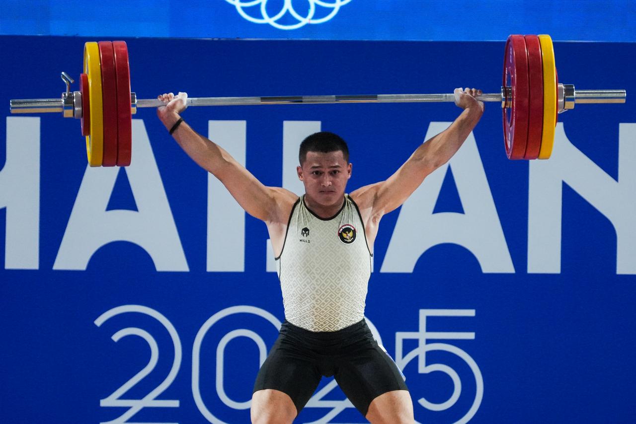Chonburi – Lifter andalan merah putih, Rizki Juniansyah menunjukkan keperkasaannya saat tampil di SEA Games 2025 di Chonburi Sports School, Chonburi, Senin (15/12). Lisfter berpangkat Letda TNI ini tidak hanya mempersembahkan medali emas, tapi juga memecahkan rekor dunia saat turun di kelas 79 kg.