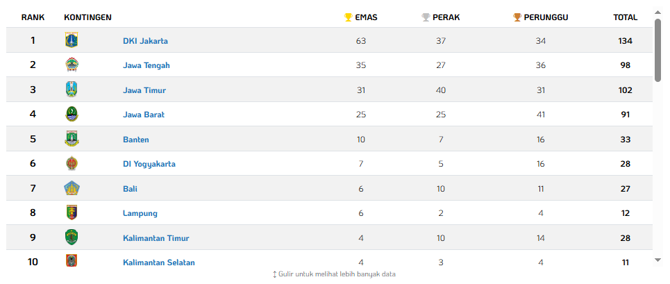 Sementara itu, Jawa Barat yang sempat menjadi pesaing utama tuan rumah pada awal kompetisi kini harus turun ke posisi keempat dengan perolehan 25 emas, 25 perak, dan 41 perunggu. Di belakangnya, Banten tampil impresif dengan lonjakan dari 2 emas menjadi 10 emas, mengukuhkan diri di posisi kelima.