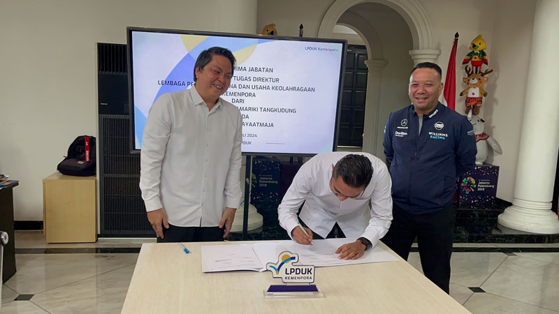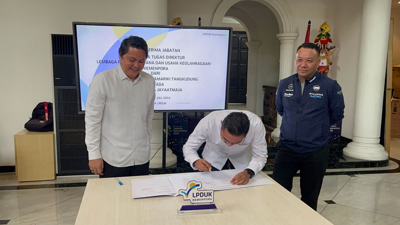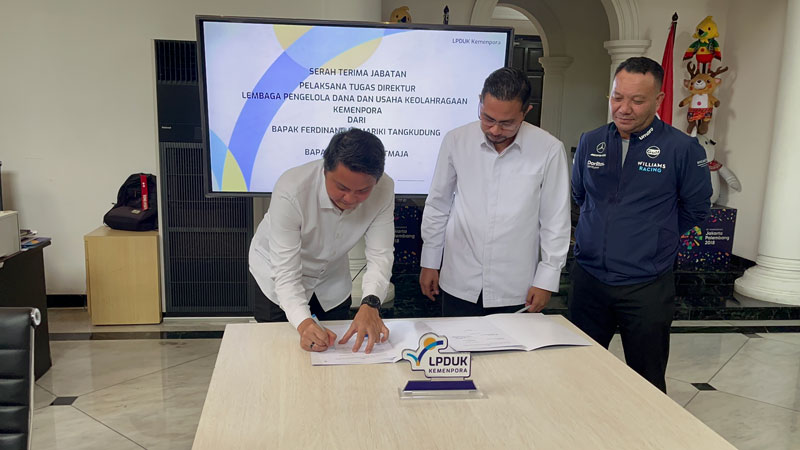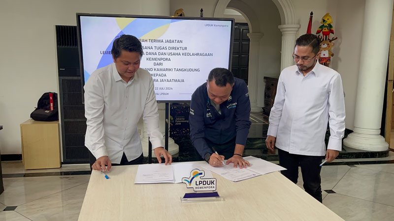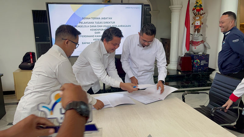 LPDUK – Indra Jayaatmaja, S.IP, M.AP melakukan Serah Terima Jabatan Pelaksana Tugas (Plt) Direktur Lembaga Pengelola Dana dan Usaha Keolahragaan (LPDUK) di Kantor LPDUK Jakarta, Senin (22/7), dari pejabat sebelumnya, Ferdinand Kamariki Tangkudung, S.H.