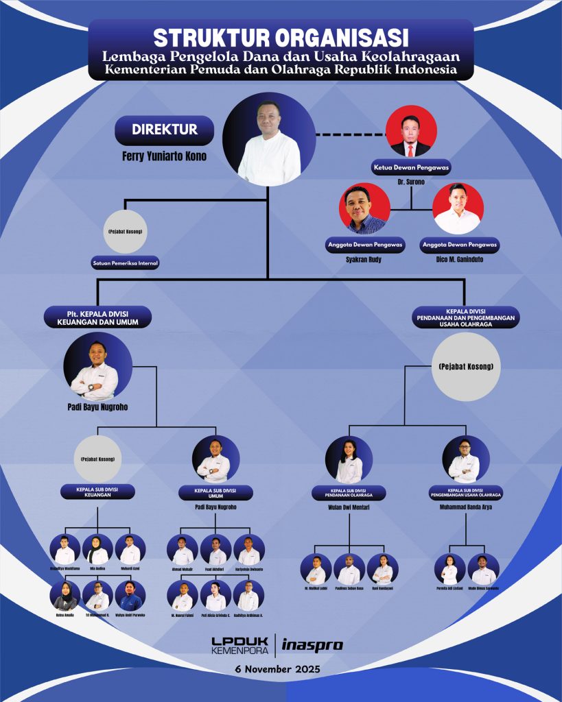 Susunan organisasi Lembaga Pengelola Dana dan Usaha Keolahragaan (LPDUK) setelah menjadi Badan Layanan Umum (BLU) akan disesuaikan berdasarkan Peraturan Menteri Pendayagunaan Aparatur Negara dan Reformasi Birokrasi (Kemenpan RB) Nomor: PER/02/M.PAN/1/2007 tanggal 25 Januari 2007 tentang Pedoman Organisasi Satuan Kerja di Lingkungan Instansi Pemerintah yang Menerapkan Pola Pengelolaan Keuangan Badan Layanan Umum. Berdasarkan peraturan tersebut dan Peraturan Menpora Nomor 22 Tahun 2017 tentang Organisasi dan Tata Kerja LPDUK, disebutkan bahwa struktur organisasi BLU terdiri dari unsur Pimpinan BLU, Pejabat Keuangan, Pejabat Teknis, Satuan Pengawas Intern, dan Pejabat Pelaksana serta Dewan Pengawas.