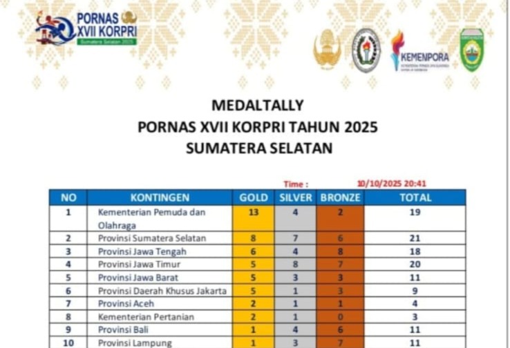 Tambahan dua emas dari Tuti memantapkan posisi Kemenpora di puncak klasmen sementara. Hingga Jumat (10/10) malam, Kemenpora masih di posisi teratas dengan 13 emas, empat perak dan dua perunggu.